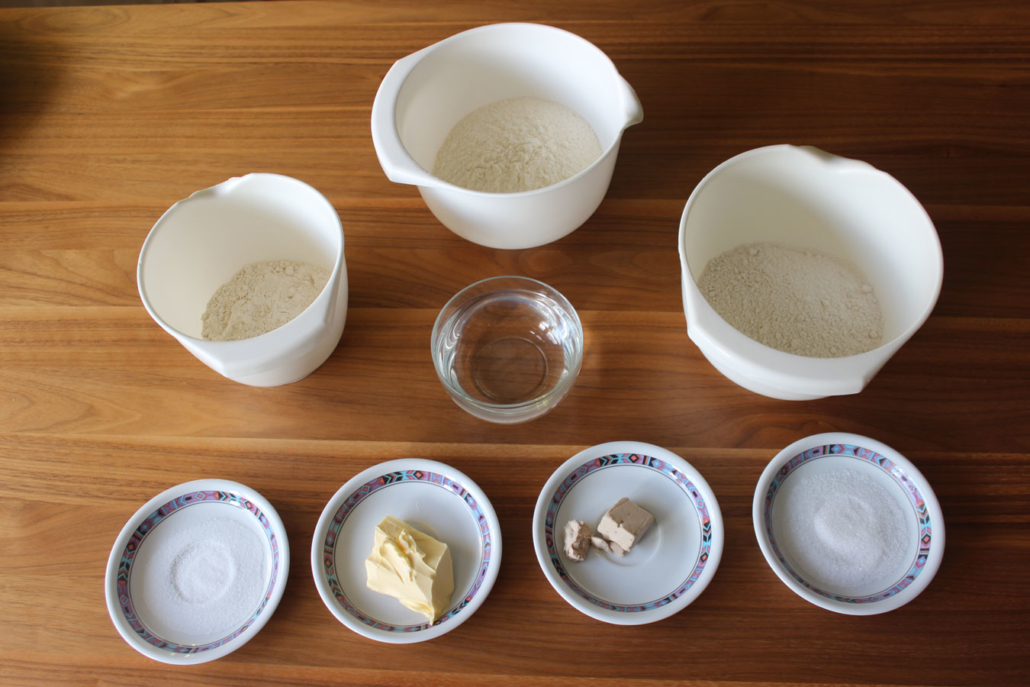 as Wasser mit der Waage abwiegen und in die Rührschüssel geben. Nun die Hefe kleingebröselt dem Wasser hinzufügen und mit dem Schneebesen verrühren.