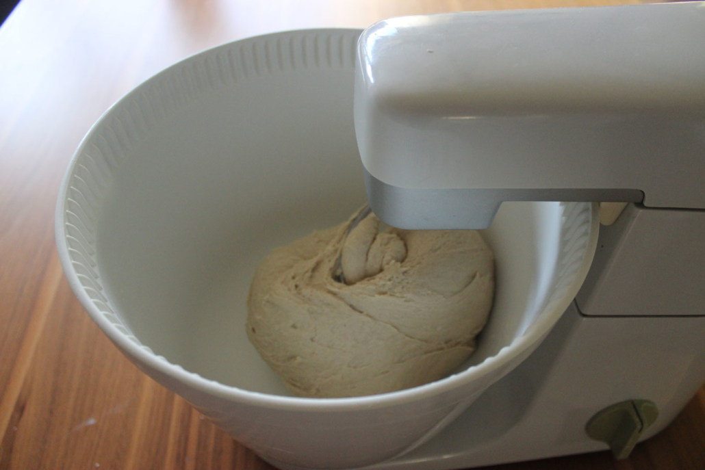 In der Maschine auf langsamer Stufe kurz anschlagen und die Geschwindigkeit langsam erhöhen. Solange rühren bis die Zutaten gut vermengt sind und ein geschmeidiger Teig entstanden ist.