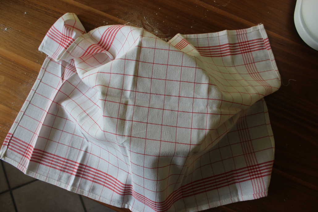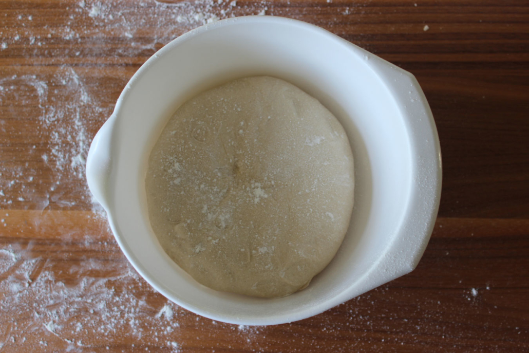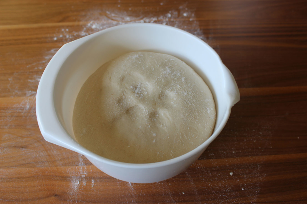Den Teig aus der Schüssel auf eine leicht bestäubte Mehlfläche geben, kurz durchkneten und zu einer Kugel formen. Diese in eine Schüssel legen und mit einem Tuch abdecken.