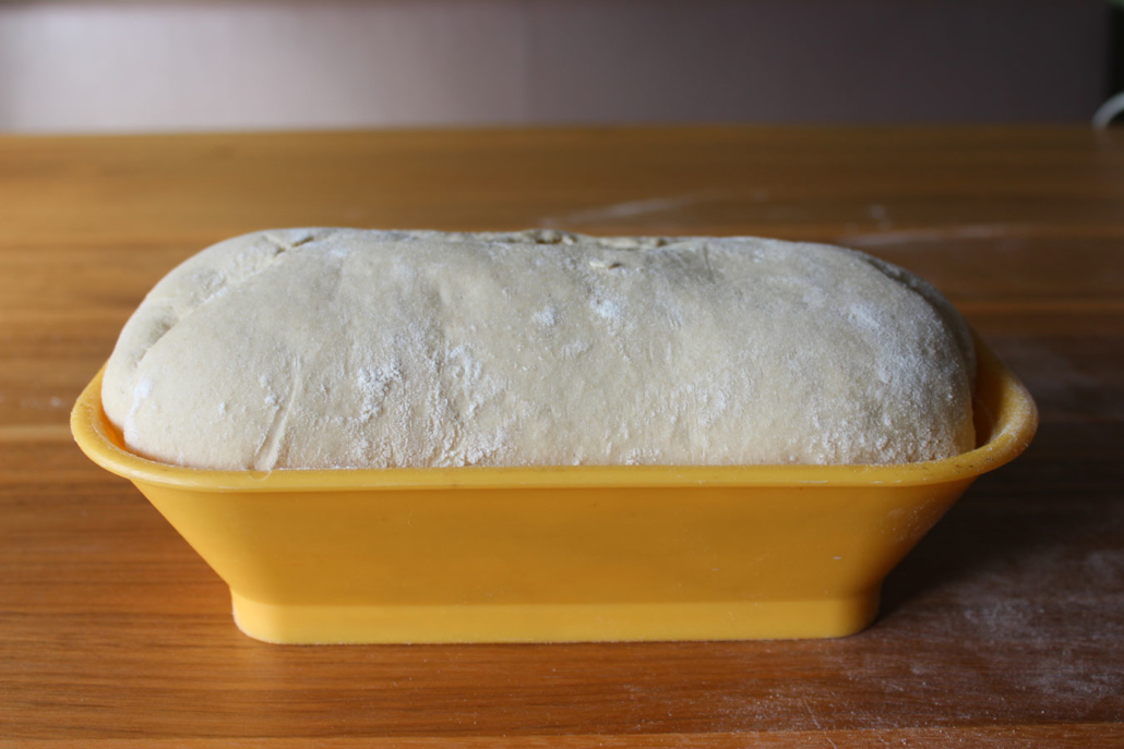 Im nächsten Arbeitsschritt den Teig länglich in Form bringen, so dass der Teig in die Brotbackform passt. Wieder mit einem Tuch bedecken und warten bis der Teig über den Rand getreten ist.