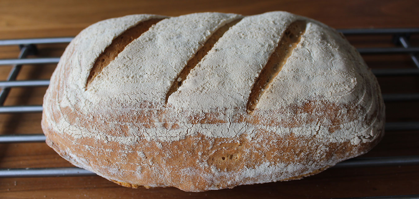 Das fertig gebackene Brot aus den Ofen holen und auf ein Gitter zum kühlen legen.