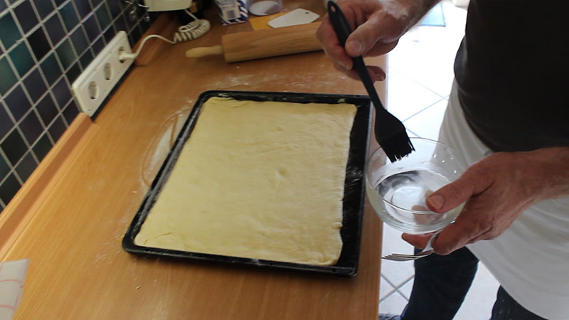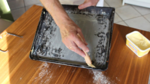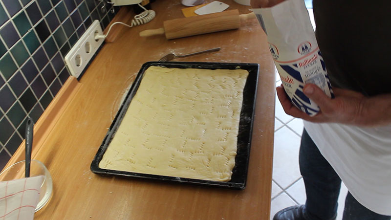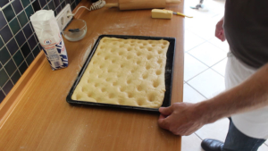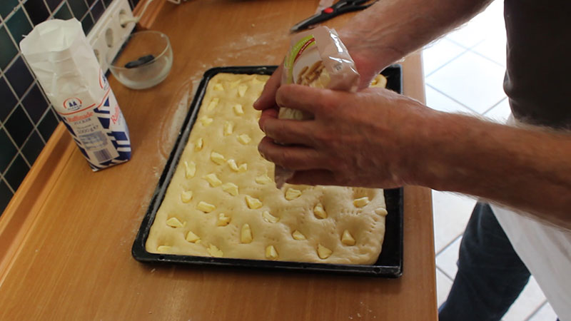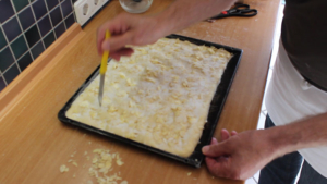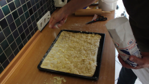 Nun den Teig wie in den Videos unten gezeigt, bearbeiten und das Backblech in den vorgeheitzten Ofen (190 Grad Umluft) einschieben und ca. 8 Minuten backen. Der Butterkuchen muss von unten leicht gebräunt sein (mit einem großen Messer den Teig leicht anheben).