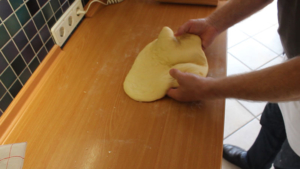 Den Teig zu einer Kugel formen (siehe Video), in eine Schüssel legen, mit einem Tuch abdecken und an einem warmen Ort 30 Minuten ruhen lassen.
