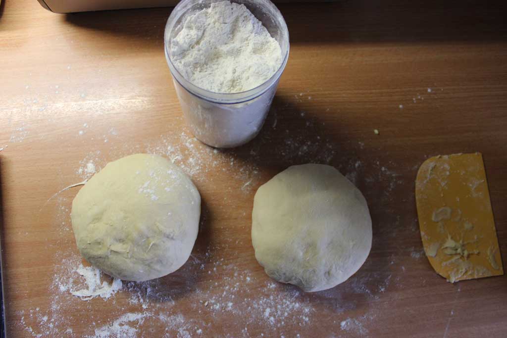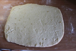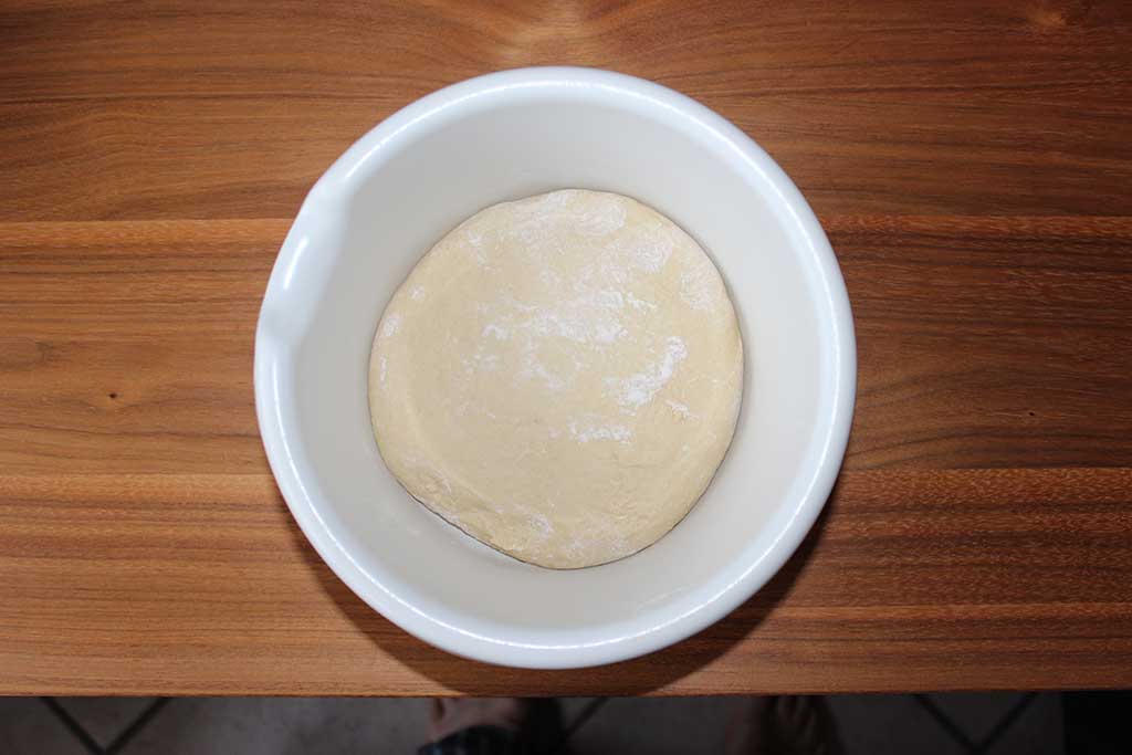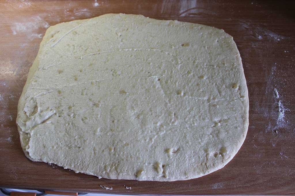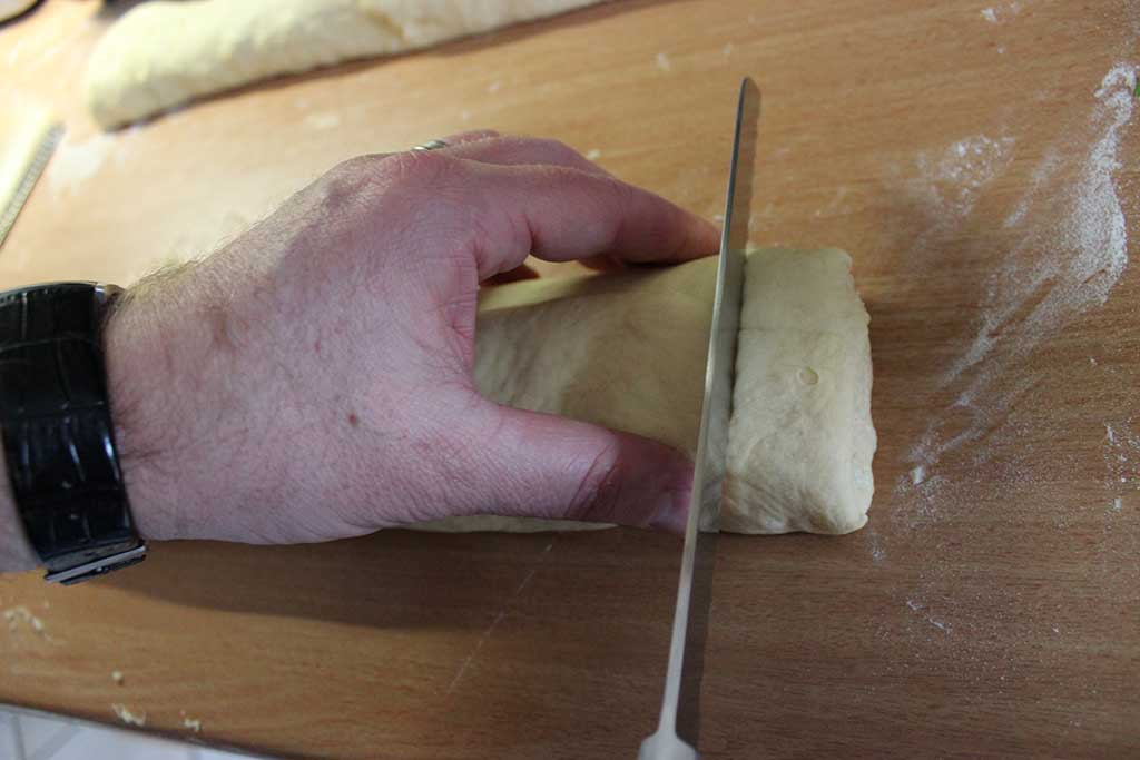 Danach den Teig auf eine mit Mehl bestäubte Arbeitsfläche legen und in 2 gleich große Stücke abwiegen. Teigstücke 10 Minuten ankommen lassen. Nun die Teigstücke zu Rechtecke ausrollen. Dies über mehrere Vorgänge durchführen, d.h. nach jedem ausrollen den Teig wieder kurz ruhen lassen und danach wieder ausrollen bis der Teig die Größe von ca. 40×30 cm erreicht hat.