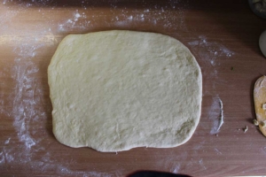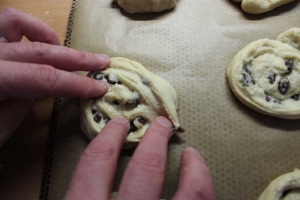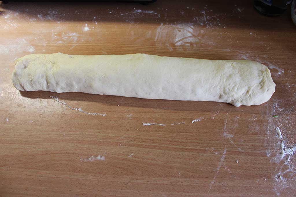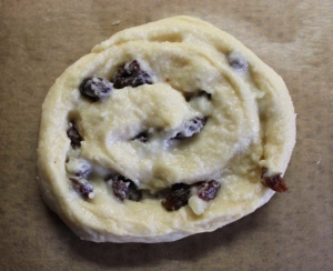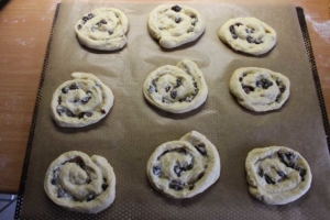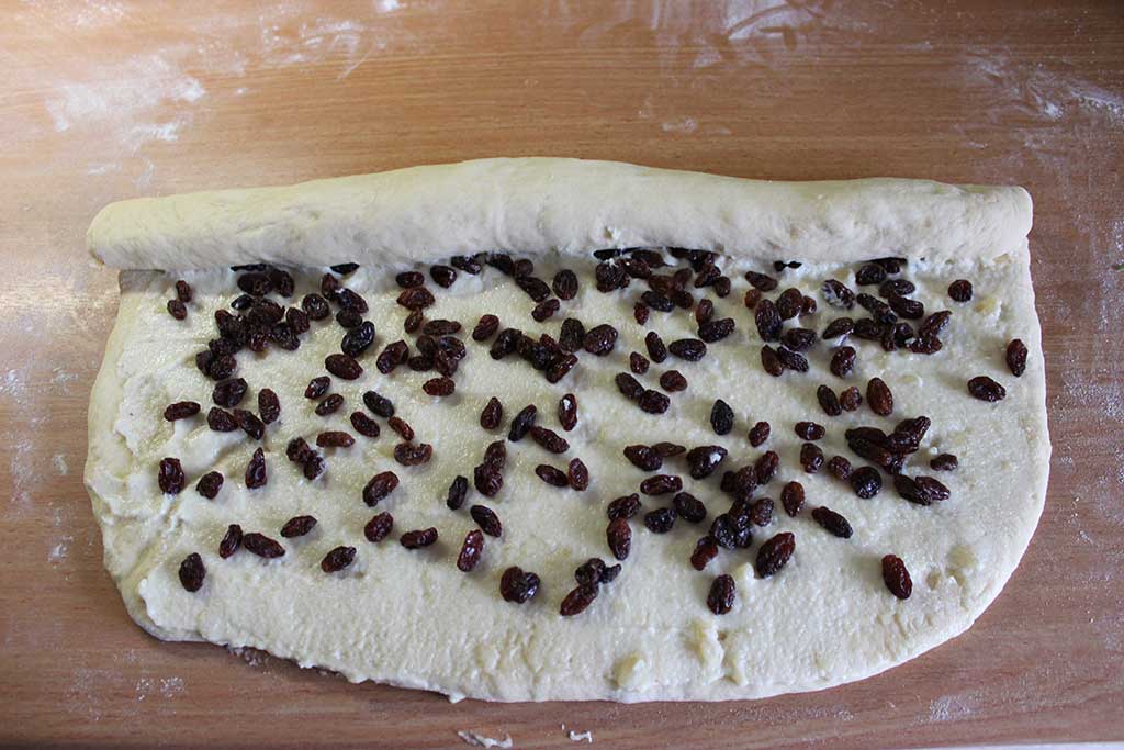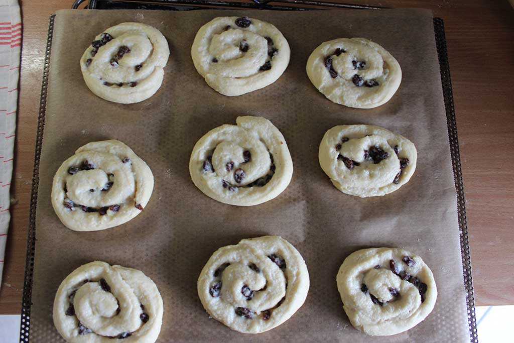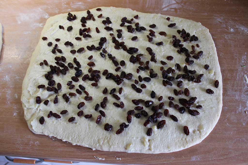 Die Masse ist dann auf den ausgerollten Teigstücken glatt zu streichen und die Rosinen sind zu verteilen. Die Teigplatte wird von oben der Längsrichtung nach aufgerollt. Die Enden der Rolle schneide ich immer ab und beginne dann mit einem geraden Kantenstück. Von der Rolle sind ca. 4cm dicke Streifen mit einem scharfen Messer abzuschneiden und auf ein mit Backpapier vorbereitetes Backblech zu legen. Die einzelnen Schnecken sind mit den Fingern vorsichtig auseinanderzuziehen bzw. in Form zu bringen. Das Backblech mit einem Tuch abdecken und ca. 20 Minuten Teigruhe einhalten.