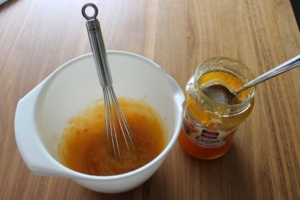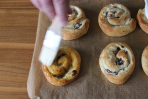 Aprikosenmarmelade in eine Schüssel geben und mit dem Schneebesen durchschlagen, so dass sich die Marmelade verflüssigt. Nach dem Backen sind die heißen Rosinenschnecken mit der Marmelade abzustreichen.