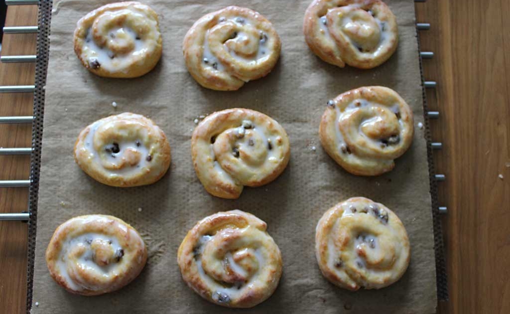 Die Backzeit beträgt ca. 7 Minuten, so dass die Rosinenschnecken auch von unten eine leichte Bräunung angenommen haben.